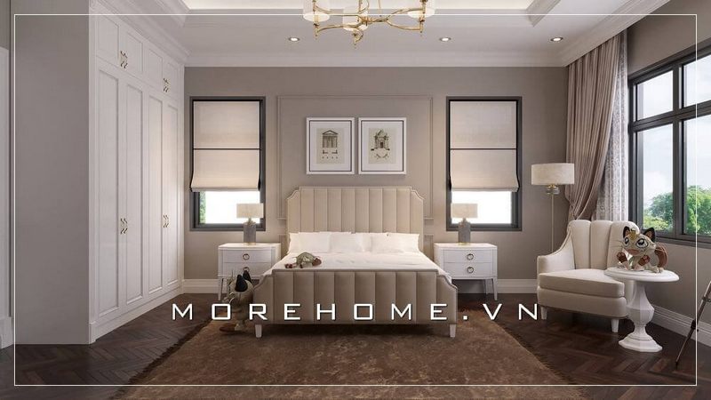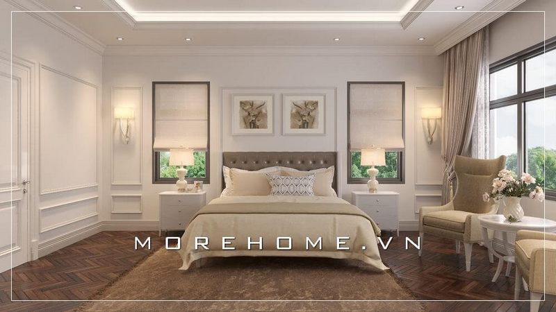 Thiết kế giường ngủ biệt thự cách điệu đầy ấn tượng, phần chân cao tạo cảm giác thông thoáng hơn cho căn phòng