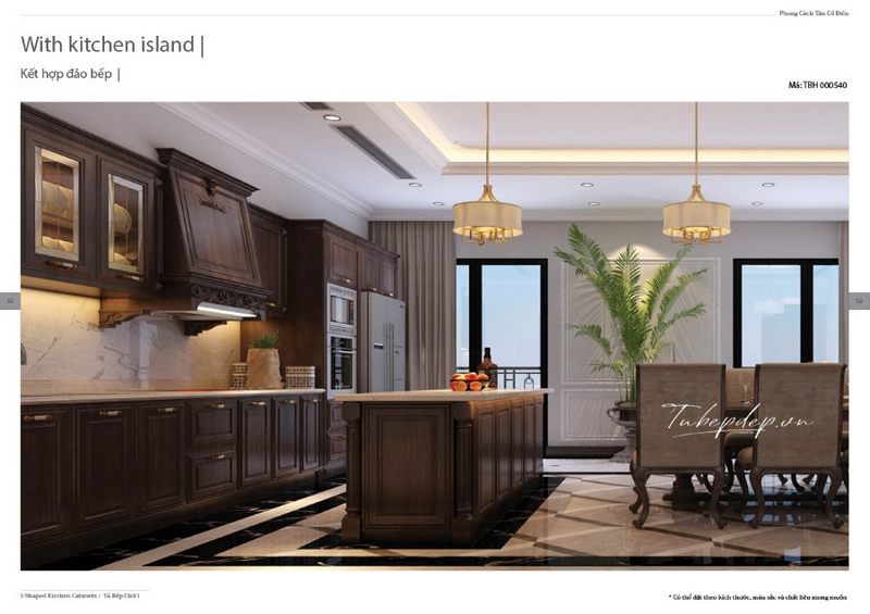 Xu hướng thiết kế phòng bếp có đảo độc lập ngày càng được ưa chuộng nhiều hơn. Nội thất phòng bếp từ gỗ óc chó kiểu tân cổ điển đẳng cấp dành cho các không gian rộng lớn của biệt thự, nhà phố, chung cư cao cấp